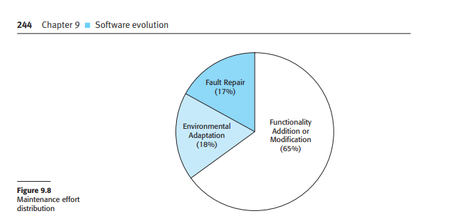 The surveys broadly agree that software maintenance takes up a higher proportion of IT budgets than new development (roughly two-thirds maintenance, one-third development). They also agree that more of the maintenance budget is spent on implementing new requirements than on fixing bugs. Figure 9.8 shows an approximate distribution of maintenance costs. The specific percentages will obviously vary from one organization to another but, universally, repairing system faults is not the most expensive maintenance activity. Evolving the system to cope with new environments and new or changed requirements consumes most maintenance effort.