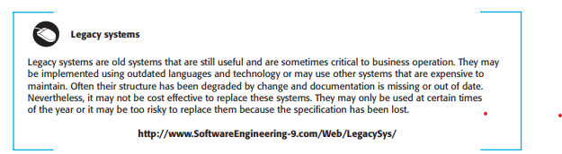 perhaps optimized for efficiency rather than understandability. System documentation may be lost or inconsistent. Old systems may not have been subject to